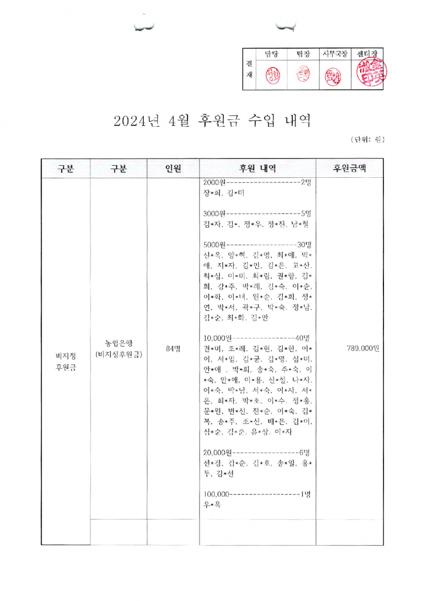 2024년 4월 후원금 수입 내역 보고 페이지 정보 작성자 햇빛촌 조회 1,499회 작성일 24-06-05 10:01 본문 2024년 4월 후원금 수입 내역 보고 목록 이전글2024년 5월 후원금 수입 내역 보고 24.06.05 다음글2024년 집단동료상담 심화과정 참여자 모집 안내 24.05.27 댓글목록 댓글목록 등록된 댓글이 없습니다.