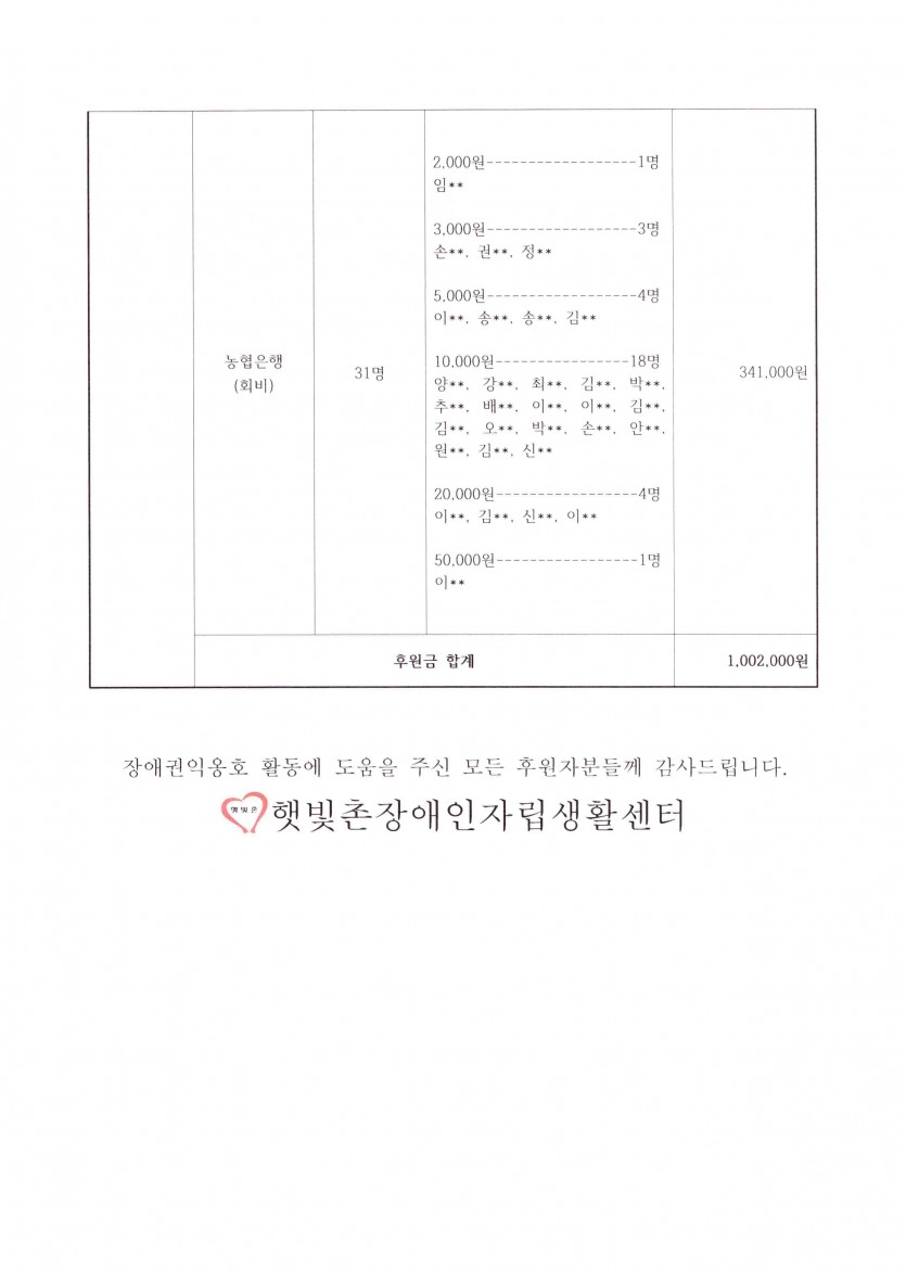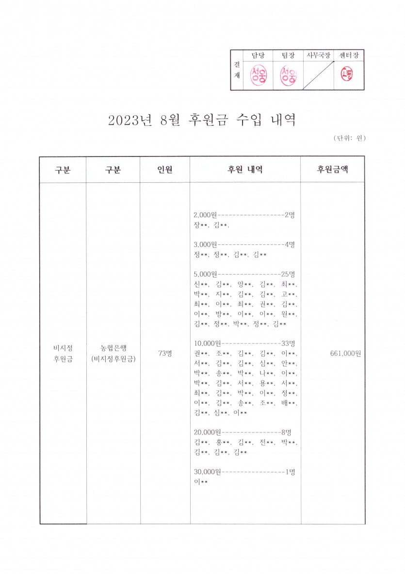 2023년 8월 후원금 수입내역보고 페이지 정보 작성자 햇빛촌 조회 1,559회 작성일 23-11-22 17:35 본문 2023년 8월 후원금 수입내역보고 목록 이전글2023년 9월 후원금 수입내역보고 23.11.22 다음글제 3회 글쓰기 자조모임 <참새방앗간> 거리 시화전 및 미술교실 작품 전시회 개최 안내 23.11.10 댓글목록 댓글목록 등록된 댓글이 없습니다.