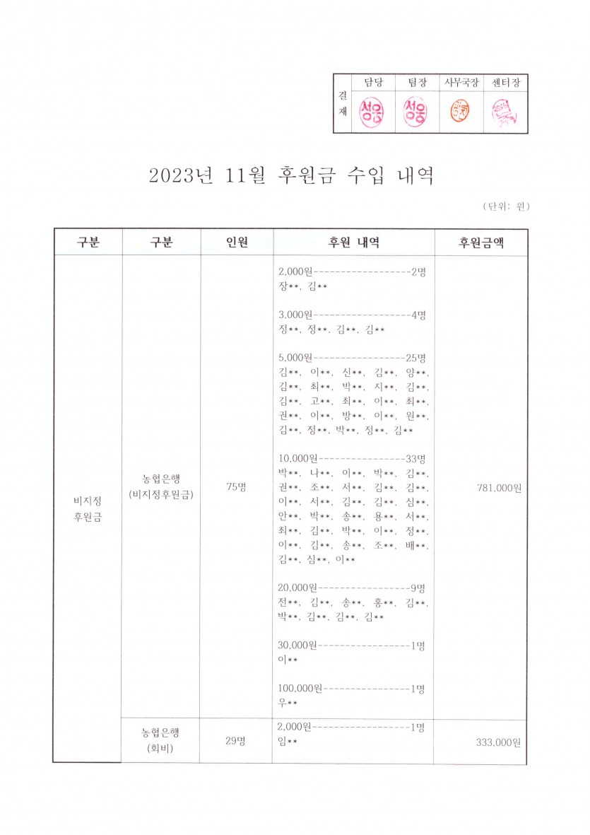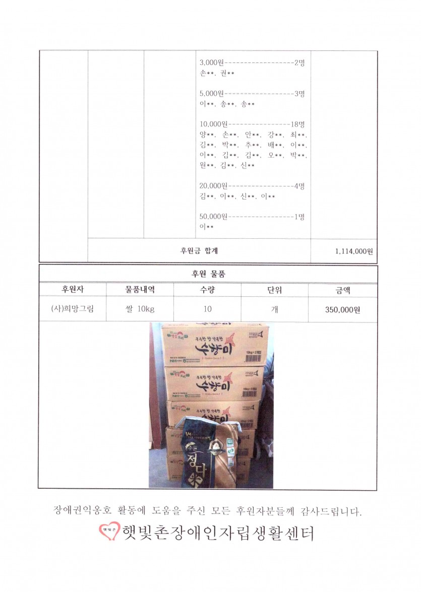 2023년 11월 후원금 수입내역보고 페이지 정보 작성자 햇빛촌 조회 1,611회 작성일 24-01-31 11:25 본문 2023년 11월 후원금 수입 내역보고 목록 이전글2024년 권리중심 중증장애인 맞춤형 공공일자리 참여자 모집 24.02.01 다음글2023년 12월 햇빛촌 소식지 24.01.29 댓글목록 댓글목록 등록된 댓글이 없습니다.