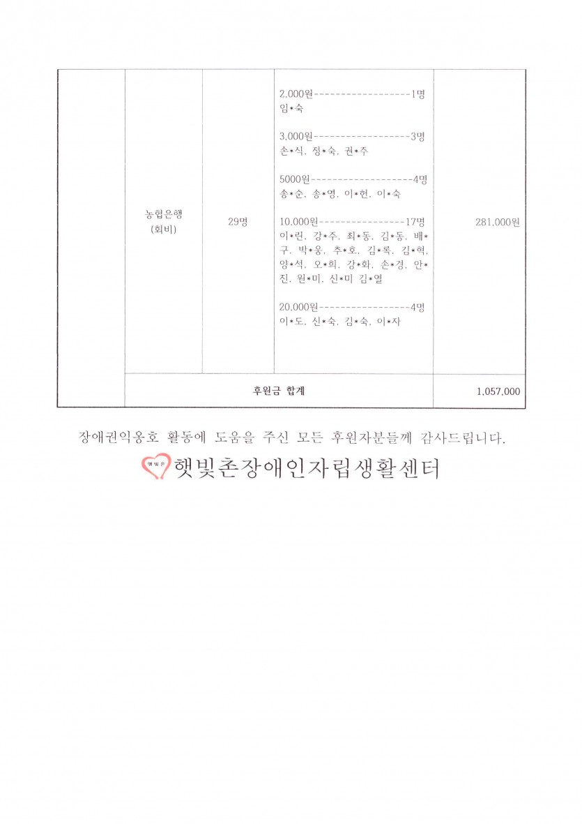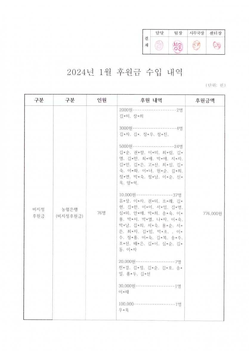 2024년 1월 후원금 수입 내역보고 페이지 정보 작성자 햇빛촌 조회 1,628회 작성일 24-02-21 14:56 본문 2024년 1월 후원금 수입 내역보고 목록 이전글2024년 정기총회 공고 24.02.21 다음글24년 IL 임시운영위원회(통합) 개최의 건 24.02.14 댓글목록 댓글목록 등록된 댓글이 없습니다.