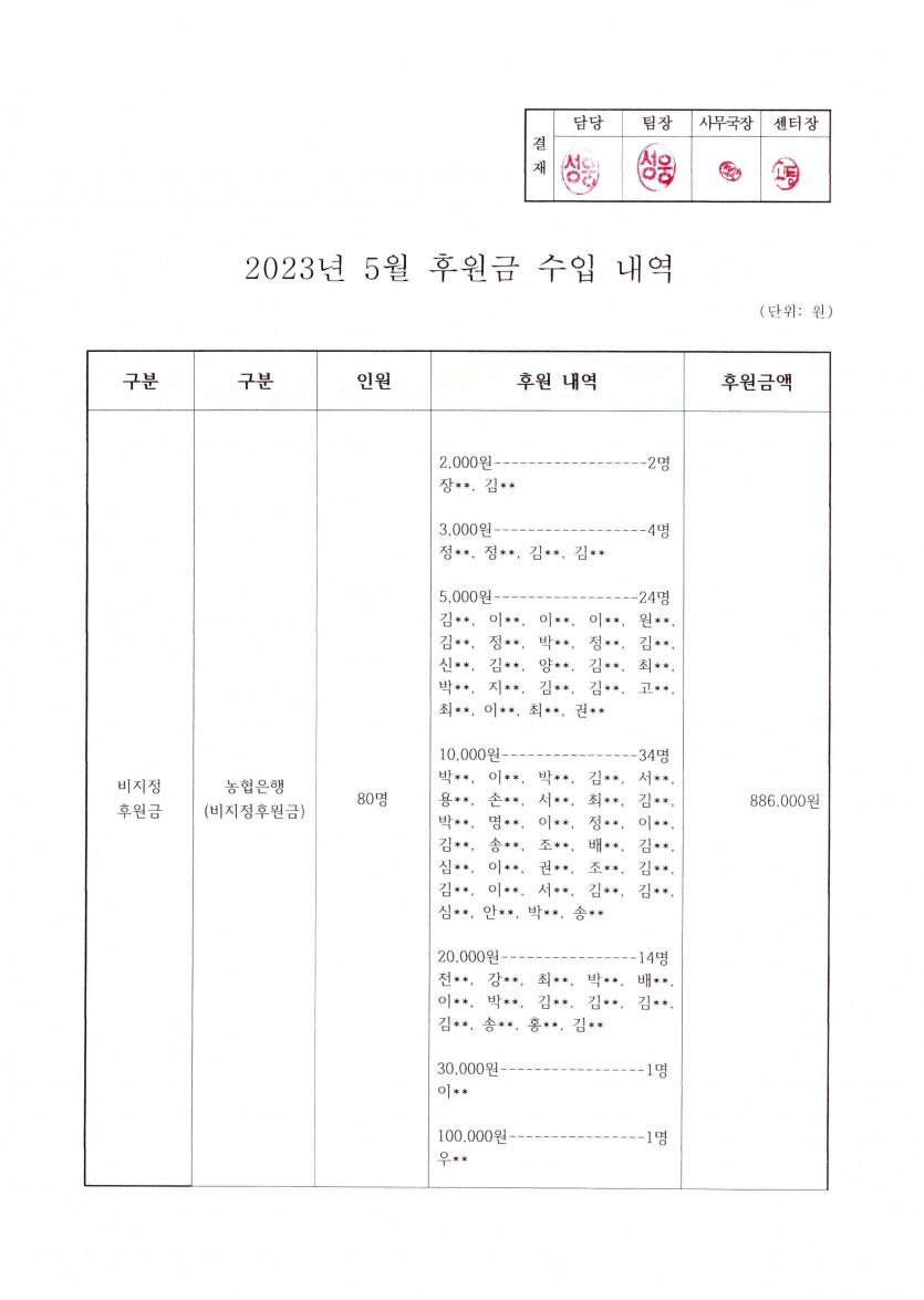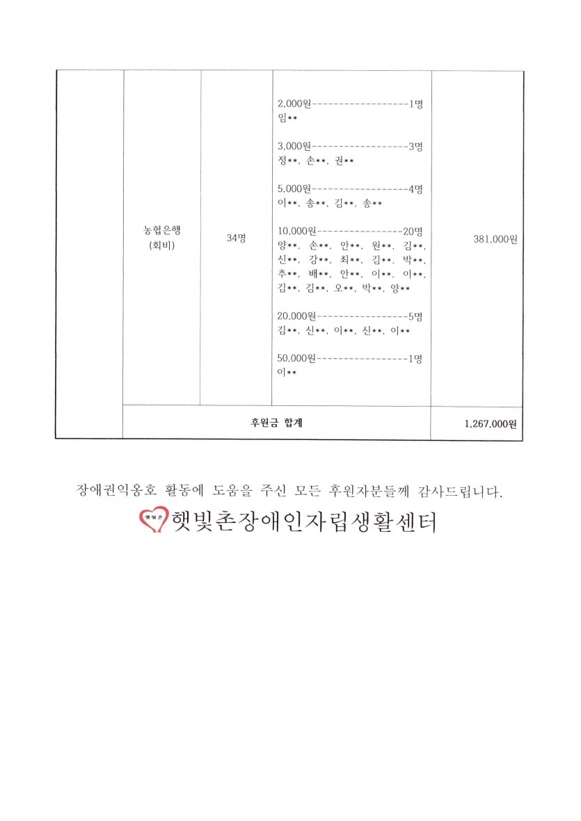 2023년 5월 후원금 수입내역보고 페이지 정보 작성자 햇빛촌 조회 1,606회 작성일 23-06-16 14:42 본문 2023년 5월 후원금 수입내역보고 목록 이전글2023년 5~6월 햇빛촌 소식지 23.07.10 다음글2023년 4월 후원금 수입내역보고 23.06.16 댓글목록 댓글목록 등록된 댓글이 없습니다.
