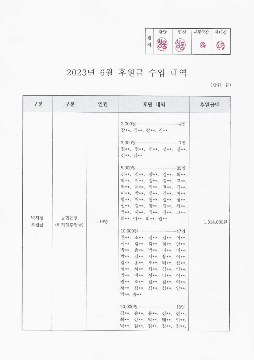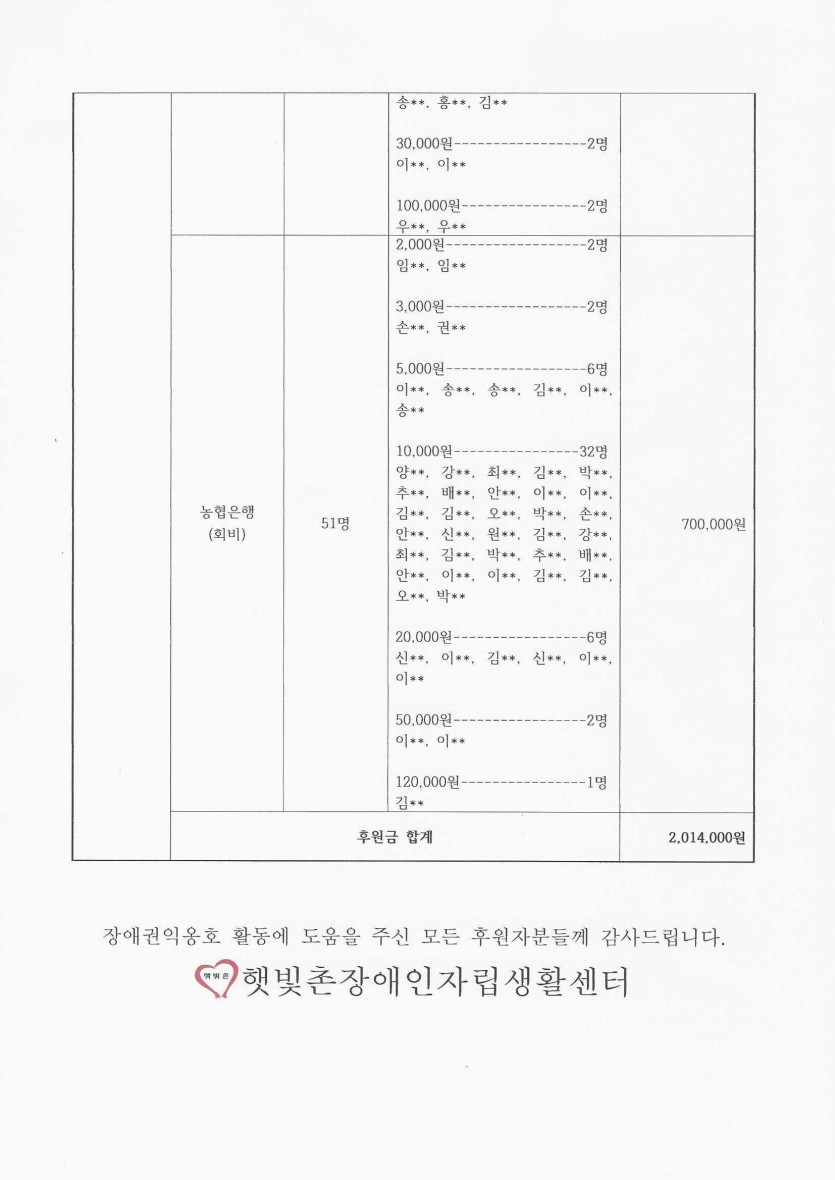 2023년 6월 후원금 수입내역보고 페이지 정보 작성자 햇빛촌 조회 1,680회 작성일 23-07-17 15:16 본문 2023년 6월 후원금 수입내역보고 목록 이전글2023년 권리중심 중증장애인 맞춤형 공공일자리 참여자 추가 모집 23.07.24 다음글2023년 5~6월 햇빛촌 소식지 23.07.10 댓글목록 댓글목록 등록된 댓글이 없습니다.