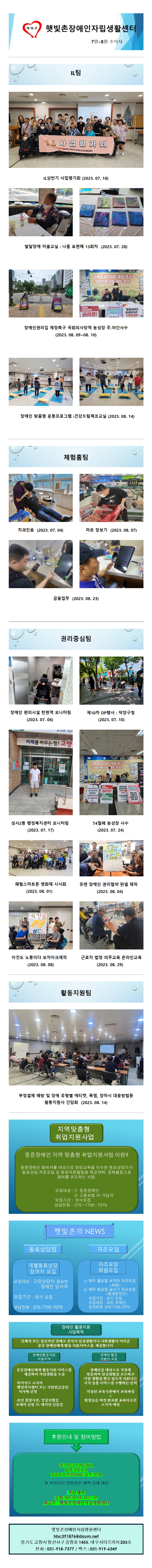 2023년 7~8월 햇빛촌 소식지 페이지 정보 작성자 햇빛촌 조회 1,702회 작성일 23-09-21 18:27 본문 2023년 7~8월 햇빛촌 소식지 목록 이전글2023년 9월 햇빛촌 소식지 23.10.13 다음글2023년 햇빛촌 장애인권주간 행사 안내 23.09.14 댓글목록 댓글목록 등록된 댓글이 없습니다.