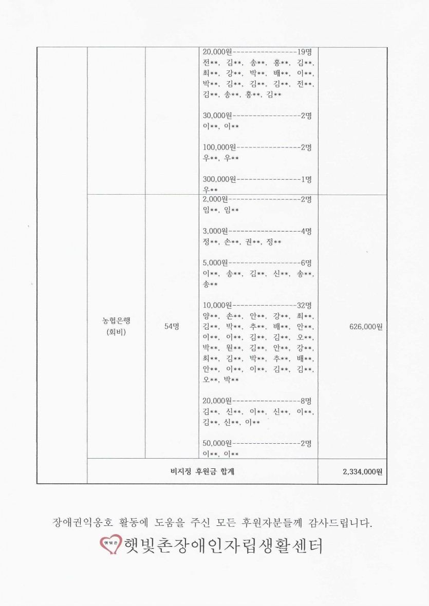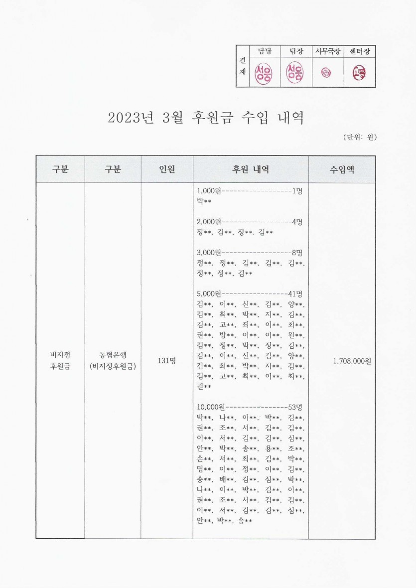 2023년 3월 후원금 수입 내역 보고 페이지 정보 작성자 햇빛촌 조회 1,669회 작성일 23-04-27 11:11 본문 2023년 3월 후원금 수입 내역 보고 목록 이전글연간 기부금 모금액 및 활용실적 명세서(2022) 23.04.28 다음글코로나19 현황 23.04.25 댓글목록 댓글목록 등록된 댓글이 없습니다.