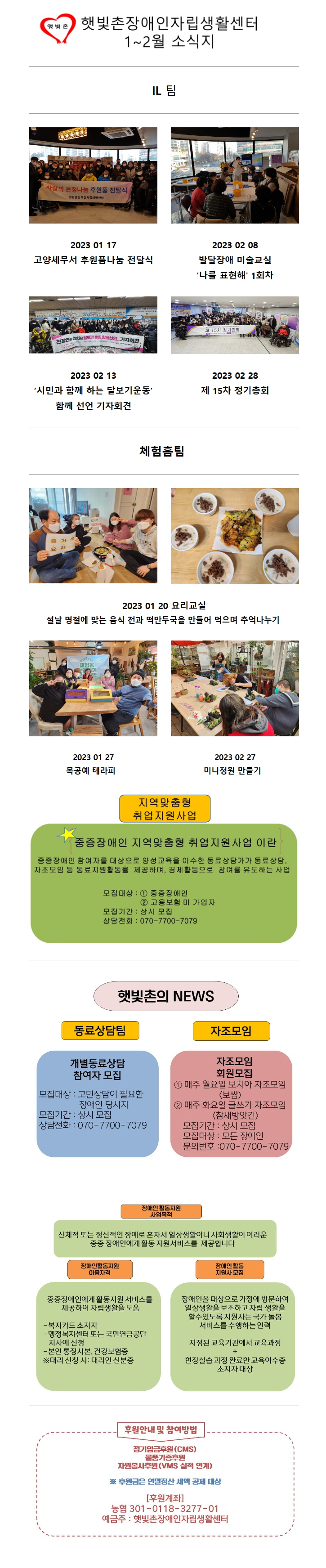2023년 1~2월 햇빛촌 소식지 페이지 정보 작성자 햇빛촌 조회 1,651회 작성일 23-05-22 09:43 본문 2023년 1~2월 햇빛촌 소식지 목록 이전글2023 발달장애 동료상담 힐링캠프 참여자 모집 안내 23.05.25 다음글연간 기부금 모금액 및 활용실적 명세서(2022) 23.04.28 댓글목록 댓글목록 등록된 댓글이 없습니다.