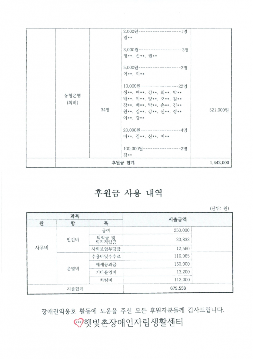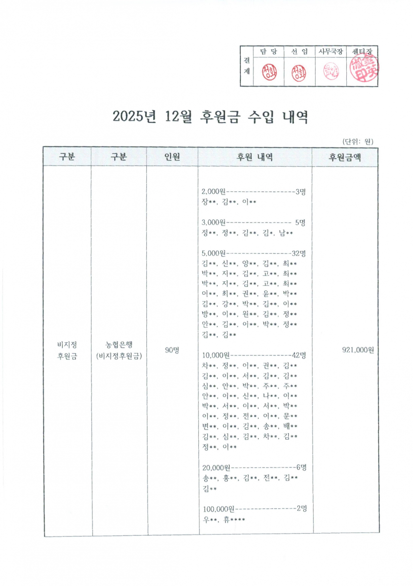 2025년 12월 후원금 수입, 사용 내역 보고 페이지 정보 작성자 햇빛촌 조회 262회 작성일 26-03-09 15:32 본문 2025년 12월 후원금 수입, 사용 내역 보고 목록 이전글2026년 1월 후원금 수입, 사용 내역 보고 26.03.09 다음글햇빛촌장애인자립생활센터 센터장 선거 후보 등록 공고 26.02.13 댓글목록 댓글목록 등록된 댓글이 없습니다.