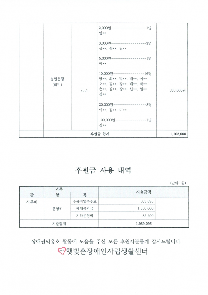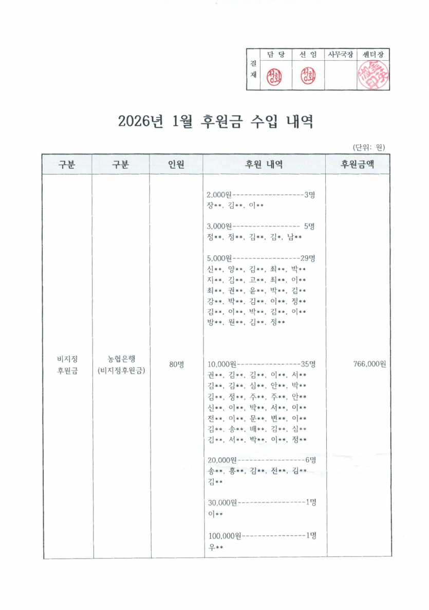 2026년 1월 후원금 수입, 사용 내역 보고 페이지 정보 작성자 햇빛촌 조회 262회 작성일 26-03-09 15:44 본문 2026년 1월 후원금 수입, 사용 내역 보고 목록 이전글햇빛촌 소식지 2026년 1~2월 26.03.10 다음글2025년 12월 후원금 수입, 사용 내역 보고 26.03.09 댓글목록 댓글목록 등록된 댓글이 없습니다.