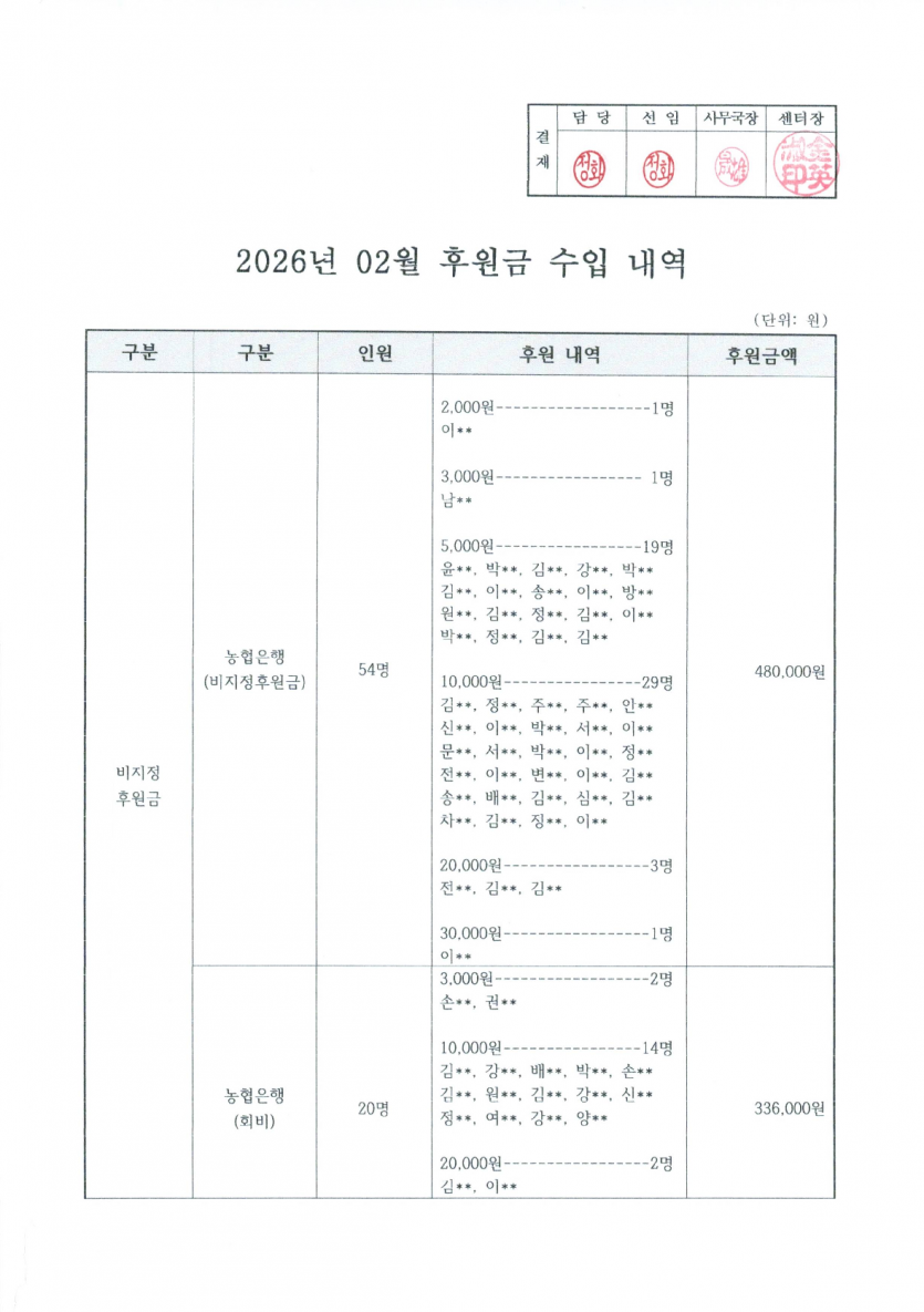 2026년 2월 후원금 수입, 사용 내역 페이지 정보 작성자 햇빛촌 조회 120회 작성일 26-03-18 16:49 본문 2026년 2월 후원금 수입, 사용 내역 목록 이전글2025 햇빛촌 결산공고 26.03.18 다음글2026년 집단동료상담 기초과정 참여자 모집 안내(마감) 26.03.18 댓글목록 댓글목록 등록된 댓글이 없습니다.