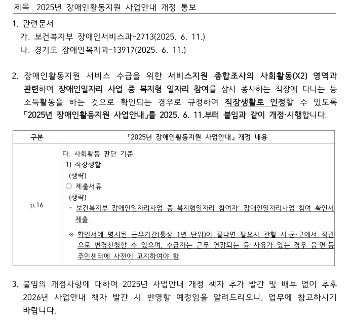 - 250611 직장생활 인정 관련 장애인활동지원 사업안내 개정사항.hwpx (79.6K) 33회 다운로드 | DATE : 2025-06-17 09:42:29