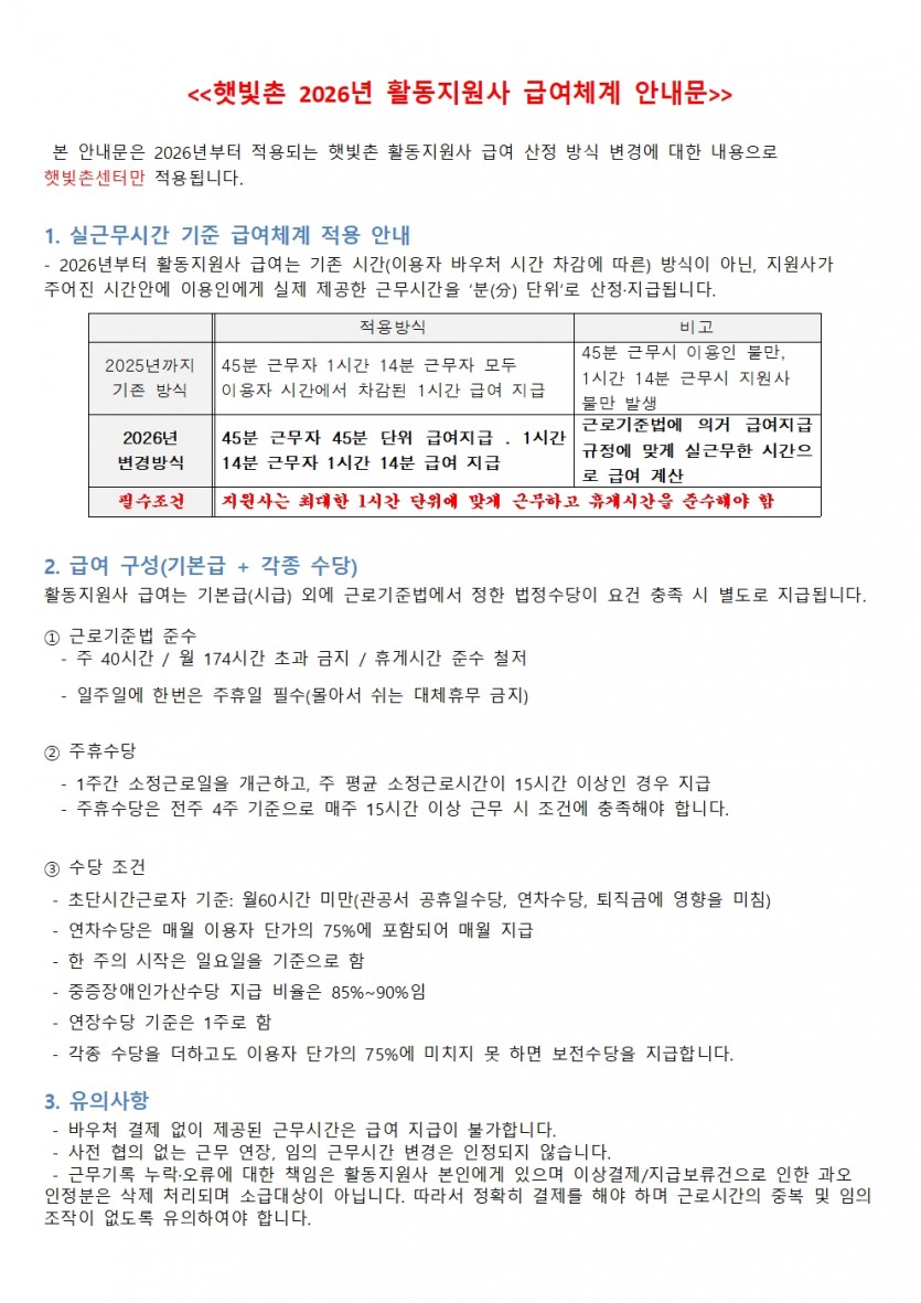 햇빛촌 2026년 활동지원사 급여체계 안내문 페이지 정보 작성자 햇빛촌 조회 760회 작성일 25-12-16 10:42 본문 . 목록 이전글휠체어 장애인의 첫 우주여행…"지금껏 가장 멋진 경험" 25.12.22 다음글장애연금과 장애인연금 차이 및 중복수급 가능성 25.12.15 댓글목록 댓글목록 등록된 댓글이 없습니다.